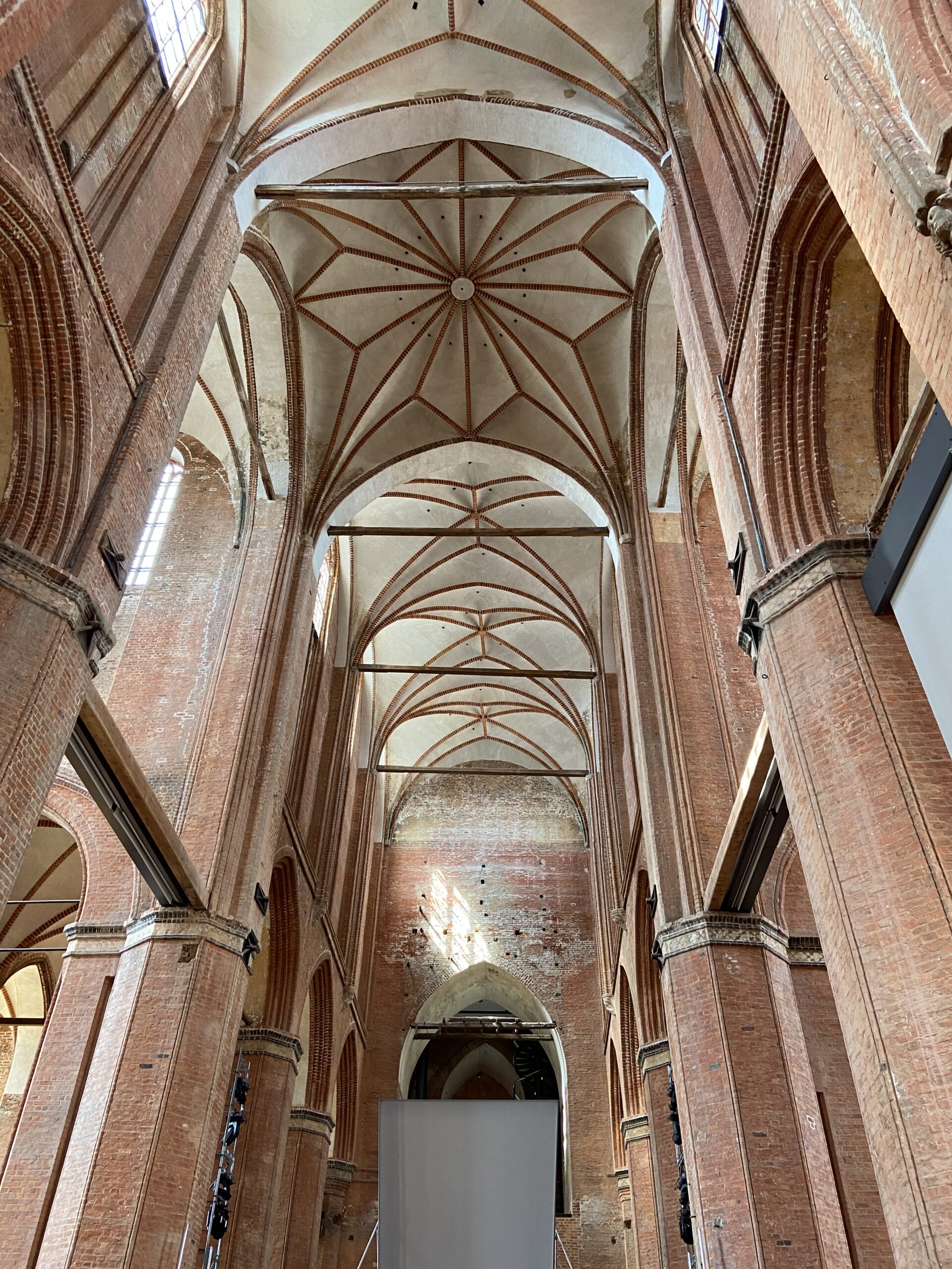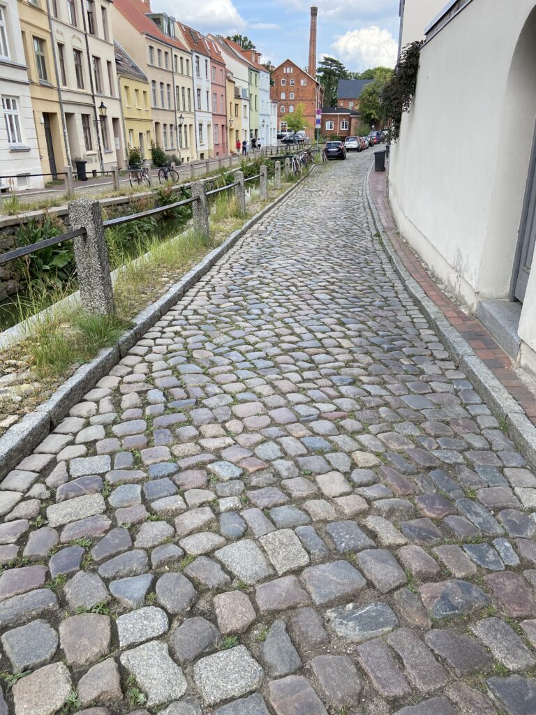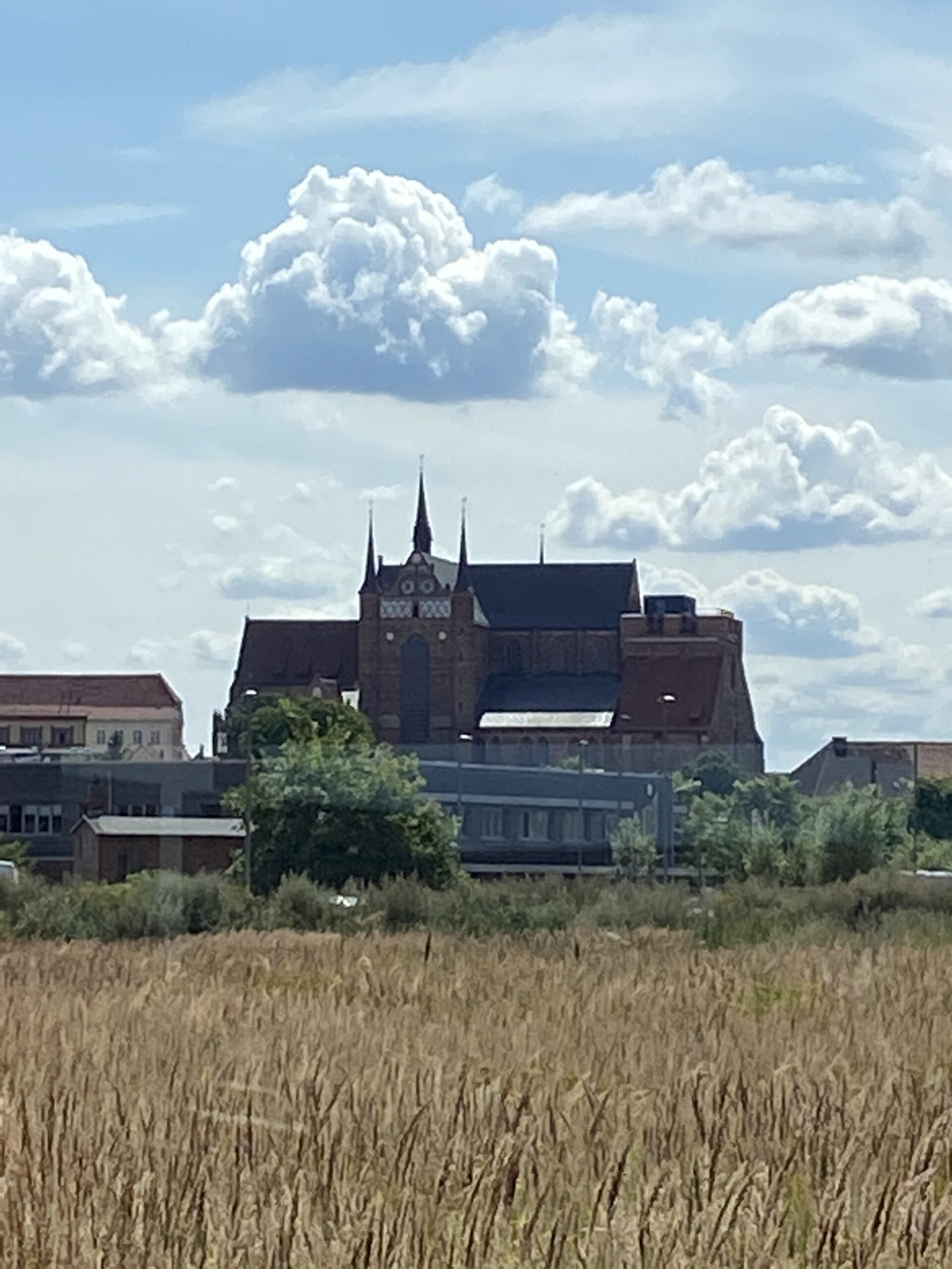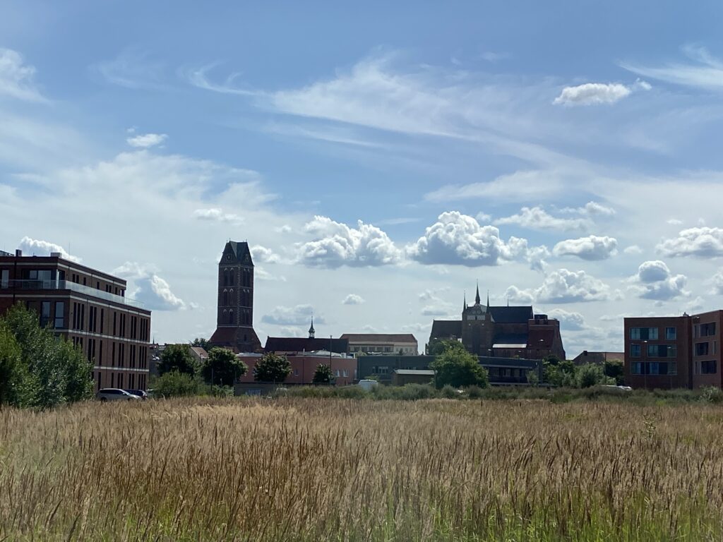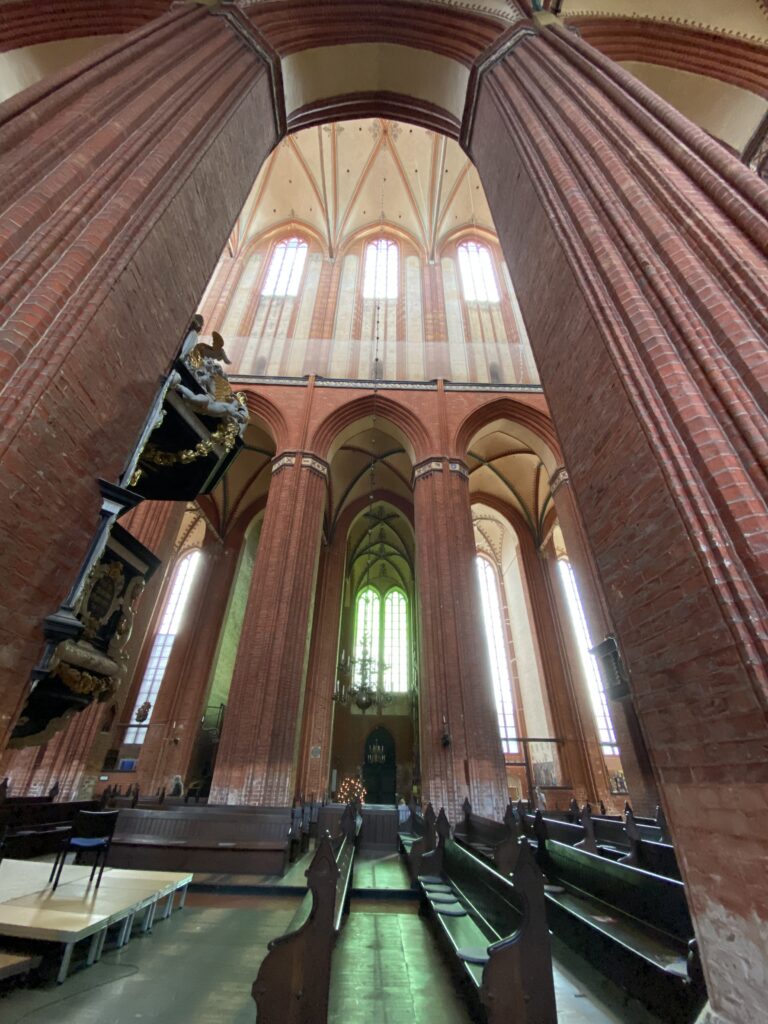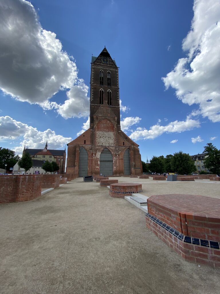 Bei St. Marien steht nur noch der Turm, die Kirche bzw. das Kirchenschiff wurde im 2. Weltkrieg teilweise zerstört und von der DDR Regierung dann vollständig – trotz Protest der Bevölkerung- gesprengt. Den Turm konnten sie jedoch nicht sprengen, weil dieser ein eingetragenes Seezeichen ist und daher erhalten bleiben muss. Heute hat man die Säulen der damaligen Kirche durch den Bau von ein paar Steinreihen angedeutet. Die Kirche selbst wieder aufzubauen ist nicht finanzierbar, da ein (!) Ziegelstein 7€ kostet.