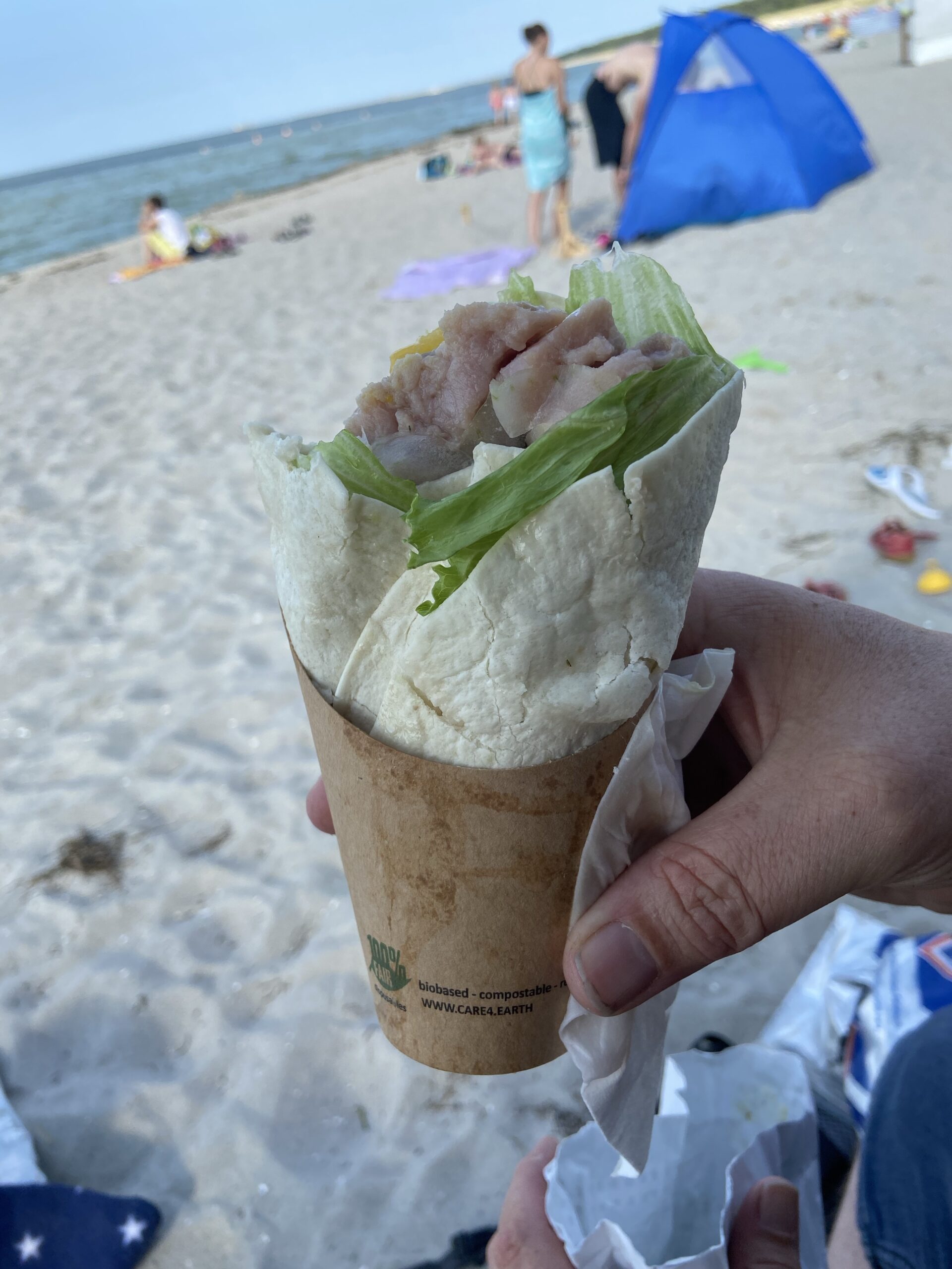 Natürlich gibt es auch vom Donnerstag das obligatorische Foto vom Essen, dieses Mal ein Fischwrap (meine Güte, bin ich froh, wenn ich mein Essen nicht mehr fotografieren muss :-))