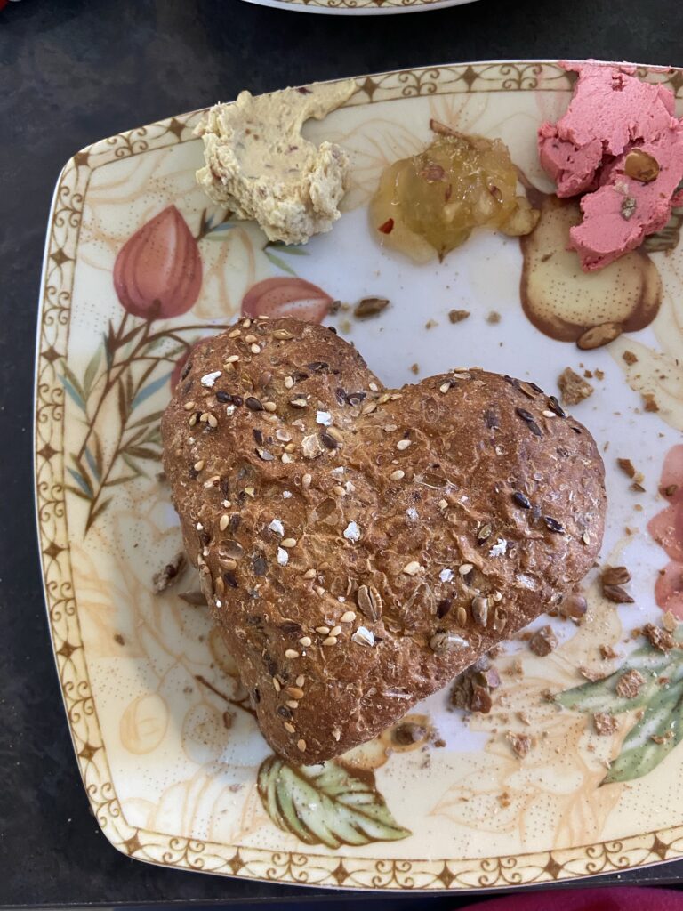 Und was kann schon schief gehen, wenn man ein Brötchen in Herzform mit wahlweise Himbeerbutter oder Ananas-Chili-Austrich zum Frühstück bekommt? Sehr lecker das alles.