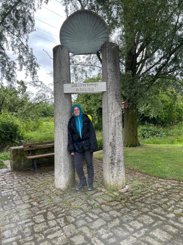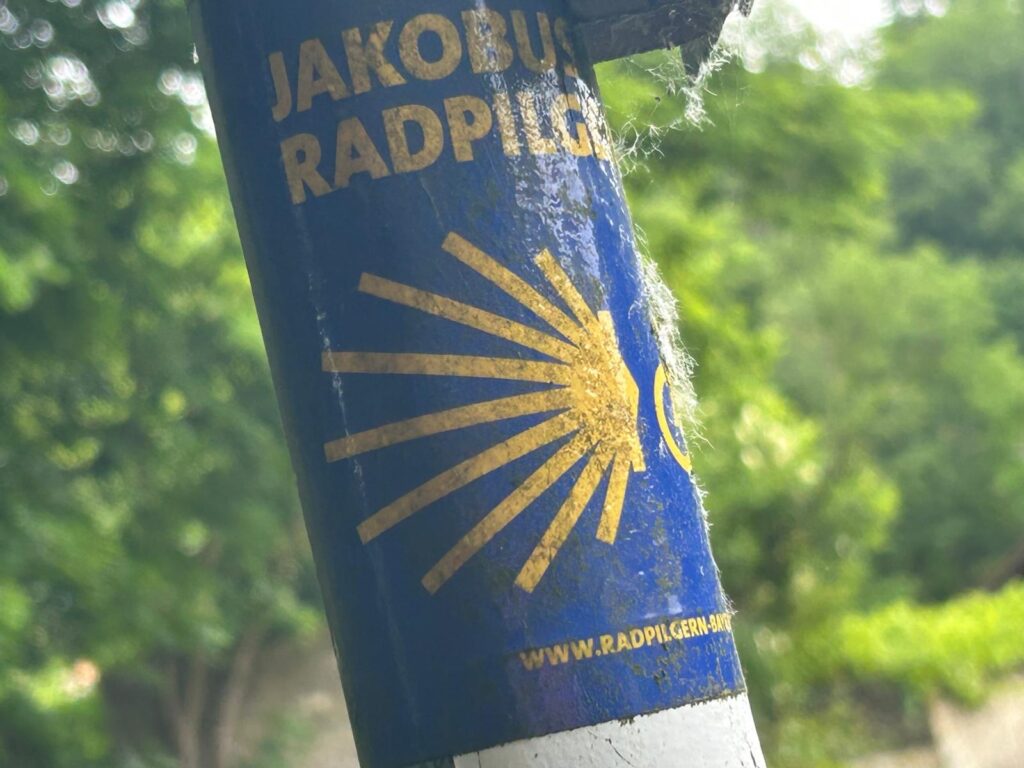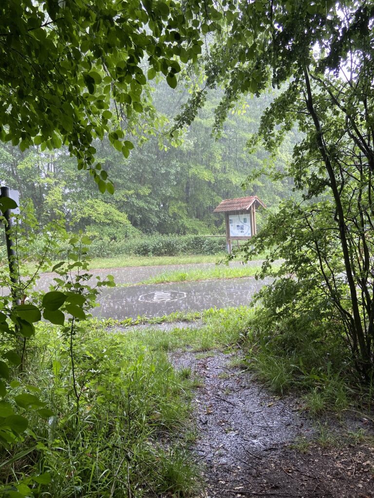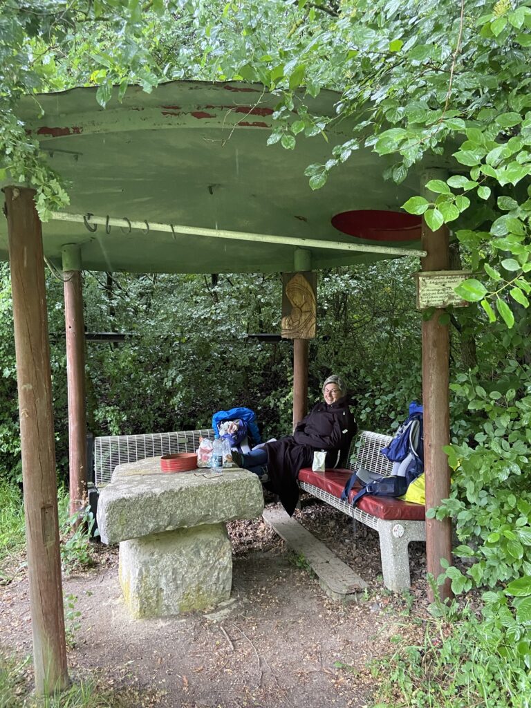 Als wir bei Carlos losgingen hat es kurzzeitig geregnet, allerdings hat sich das in Grenzen gehalten. Naiv wie wir waren, dachten wir, das mit dem Regen bekommen wir schon hin… Der Jakobsweg zweigt bei Ochsenfurt vom Main ab, was heißt, dass es für uns erst einmal bergauf ging. Aber auch das war machbar. Auch heute begleiteten uns zunächst Fahrradfahrer, Jogger und gesprächige, ältere Fussgänger. Es tröpfelte mal mehr, mal weniger, was heißt: Regenjacke an, Regenjacke aus (weil sonst zu warm). Um die Mittagszeit haben wir ein Plätzchen zum Rastmachen gesucht und das hier gefunden: