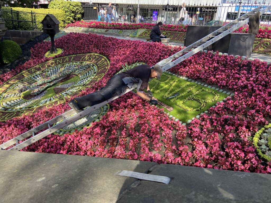 Der Gärtner auf der Leiter mit der Nagelschere – belauert und beobachtet von Touristen 🤭