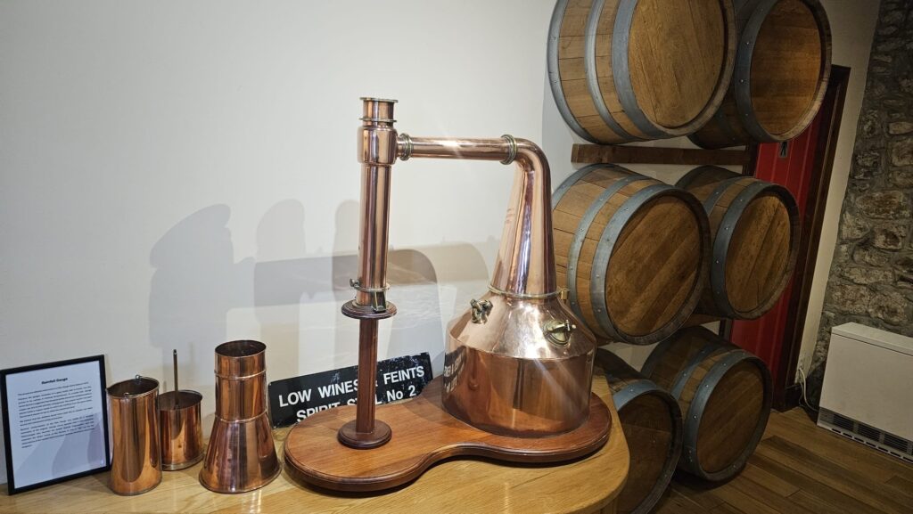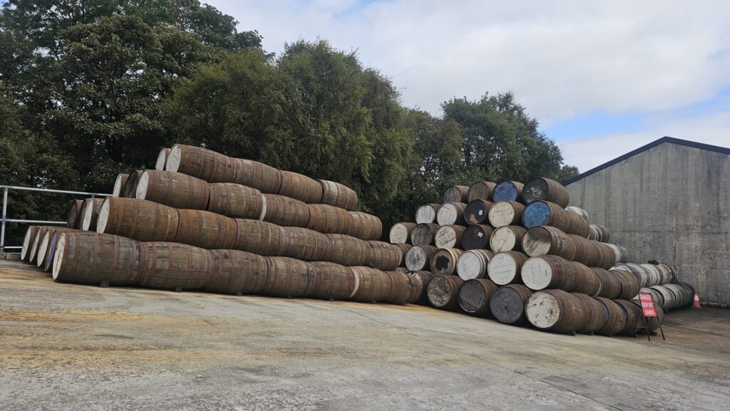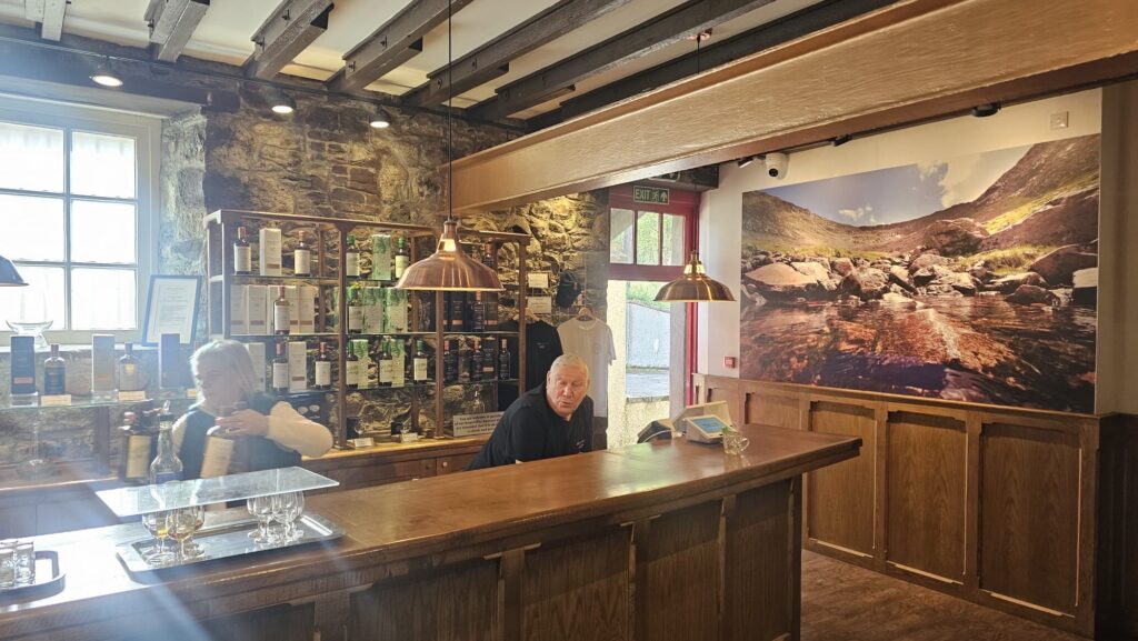 Nach der Tour durch die Destillerie (die übrigens nur 34 Angestellte hat und dem japanischen Whiskeyhersteller Nikka gehört. Die Hälfte des schottischen Whiskeys geht nach Japan, um dort zu japanischem Whiskey verarbeitet zu werden) gab es wie üblich ein Tasting. Tom hat die Tour (für ihn und mich) mit 4 Probiergläsern gebucht, wobei ich wieder ein Fahrerset bekommen haben und den Whiskey in Fläschchen abgefüllt habe. Ich hab trotzdem meine Nase mal reingehalten und mir erschließt sich auch nach knapp 2 Wochen Schottland nicht, worin der Reiz von diesem Gesöff liegen soll. Vor allem bei den torfigen Whiskeys, von denen hier dieses Mal einer zum Probieren bereit stand.